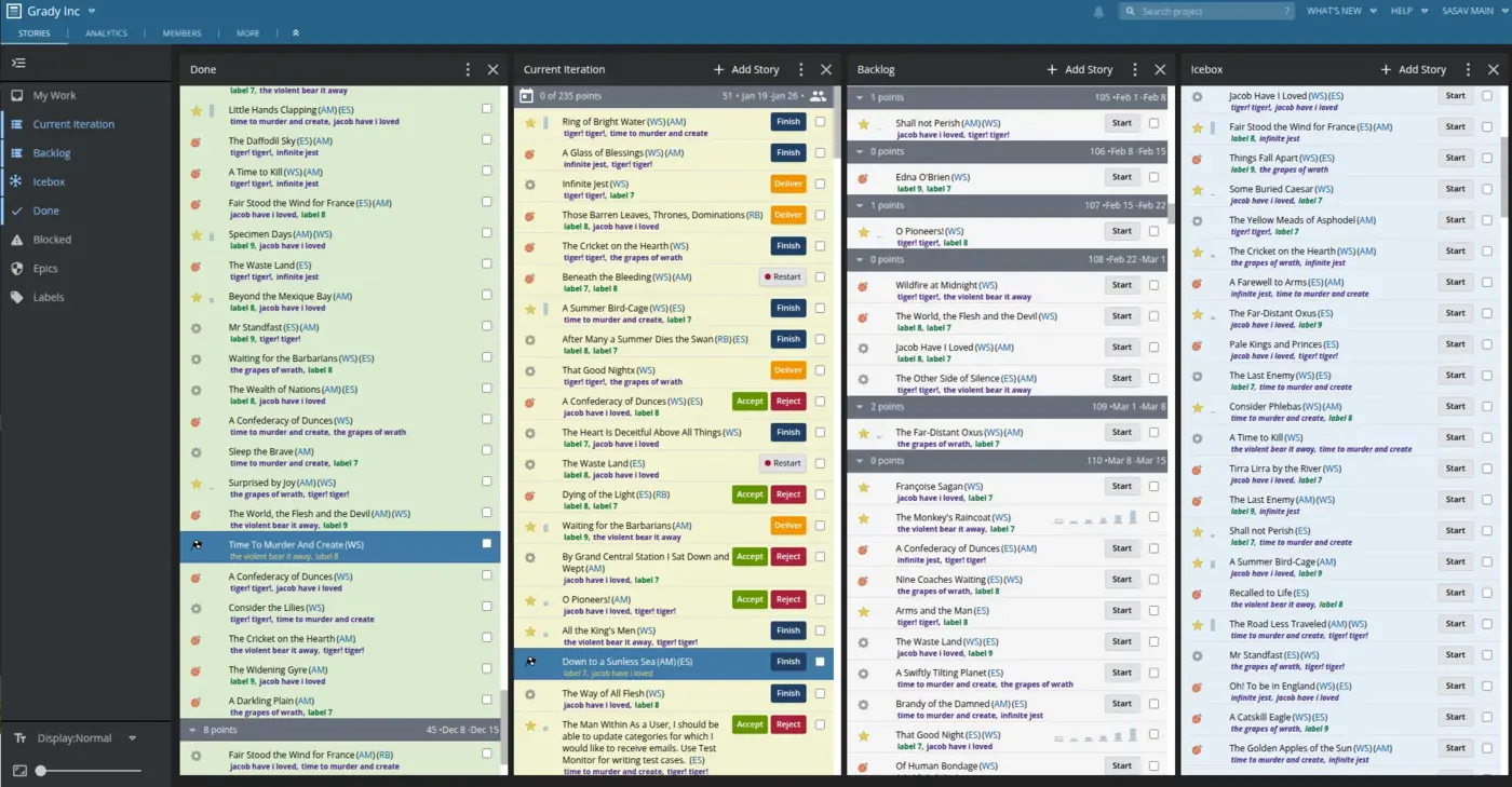Story states flow from Started to Finished to Delivered. Stakeholders can Accept or Reject completed work.